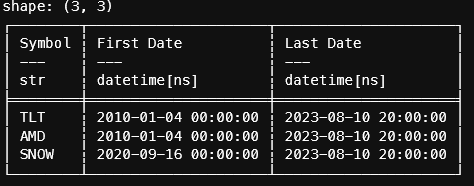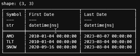 finnhub_api_key = "................"Next, we need to know what the most recent date is for our data set. Polars makes this easy.