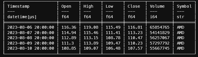 {'c': [116.81, 113.23, 110.47, 110.23, 107.57], 'h': [119.08, 115.46, 113.15, 113.89, 109.07], 'l': [115.49, 111.41, 108.78, 109.47, 106.48], 'o': [116.36, 114.94, 112.89, 111.3, 108.85], 's': 'ok', 't': [1691366400, 1691452800, 1691539200, 1691625600, 1691712000], 'v': [65854765, 54141829, 56257067, 57297792, 55667745]}Polars conversion: